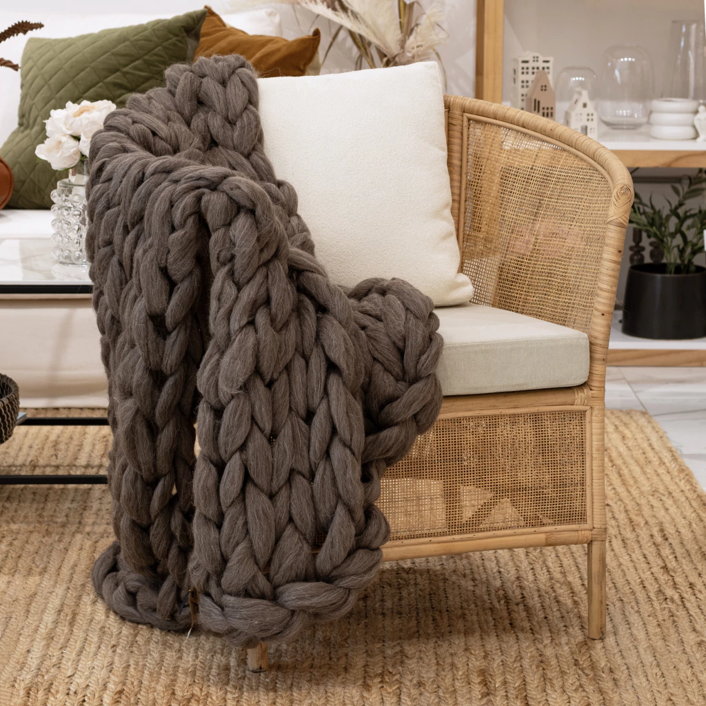 Material: Elaborada en lana, proporciona una suavidad y calidez inigualables, haciendo de cada momento de descanso una experiencia placentera. Su diseño elegante y funcional se adapta fácilmente a cualquier ambiente, ya sea en el sofá o en la cama.